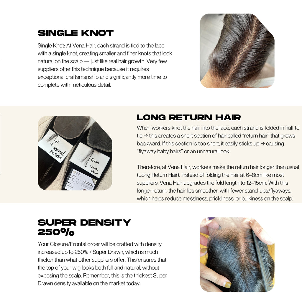 Single Knot: At Vena Hair, each strand is tied to the lace with a single knot, creating smaller and finer knots that look natural on the scalp — just like real hair growth. Very few suppliers offer this technique because it requires exceptional craftsmanship and significantly more time to complete with meticulous detail.